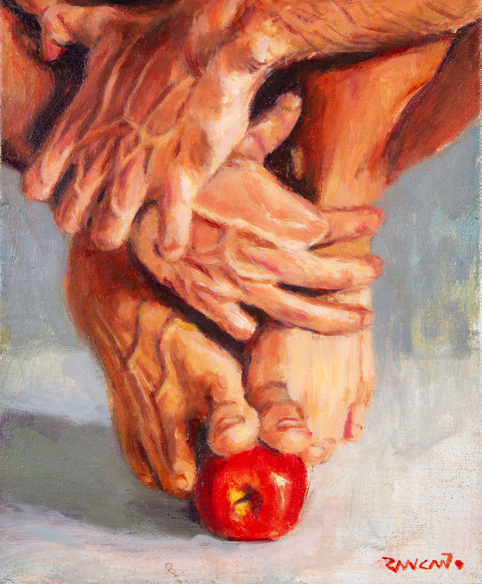 “Hardcore” is a figurative oil painting that depicts a body’s full weight pressing down on a single apple, shown through the intertwined forms of two hands and two feet gripping tightly around the fruit. The skin tones are painted with striking realism, showing veins, tendons, and subtle warmth against a muted gray-blue background, while the bright red apple glows at the center as a symbol of temptation, fragility, and human dependence. This compact 10x12 inch oil on canvas merges modern realism with symbolic still life, making it an evocative work for collectors seeking surreal figurative paintings, contemporary realism, and art exploring the tension between body and object.