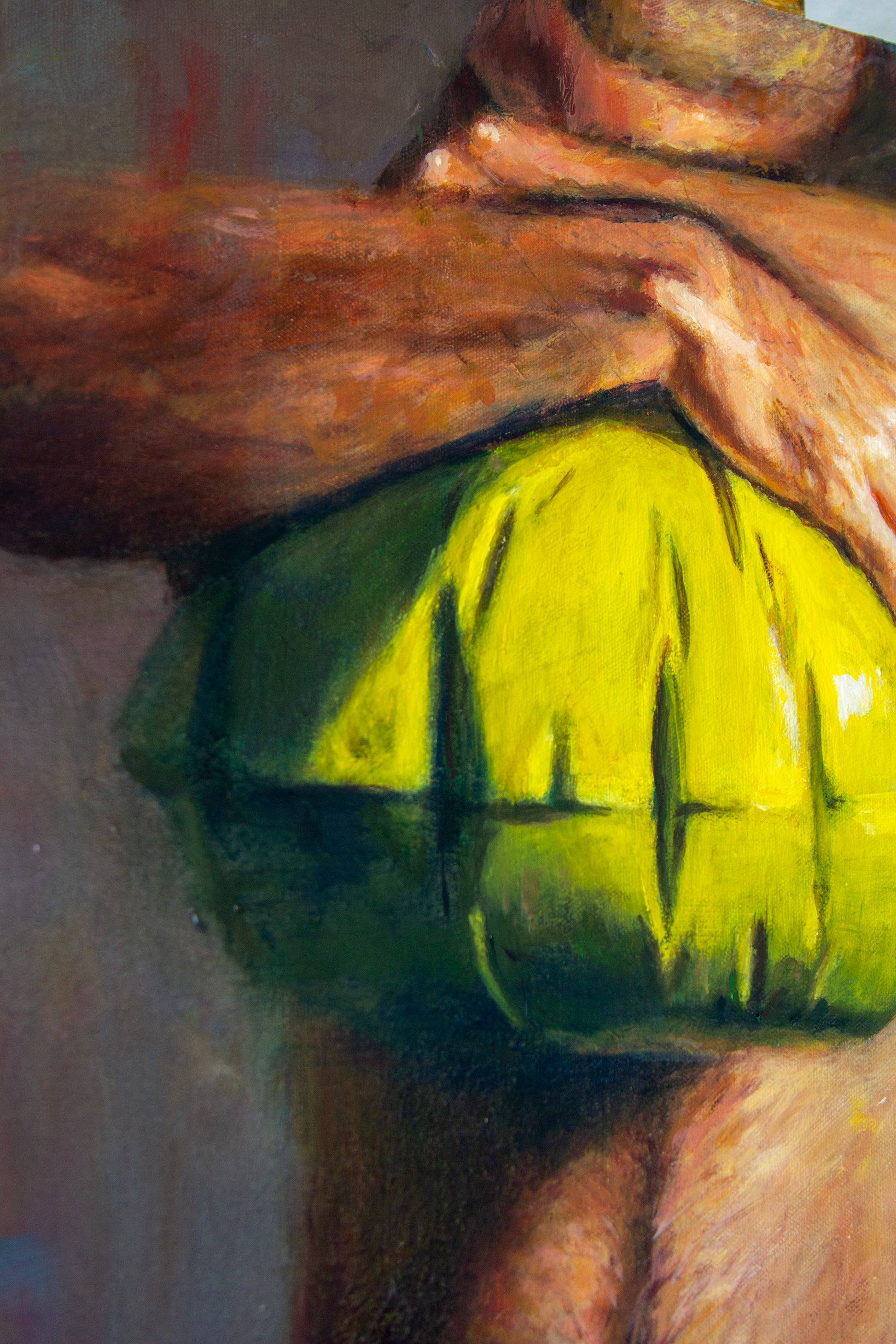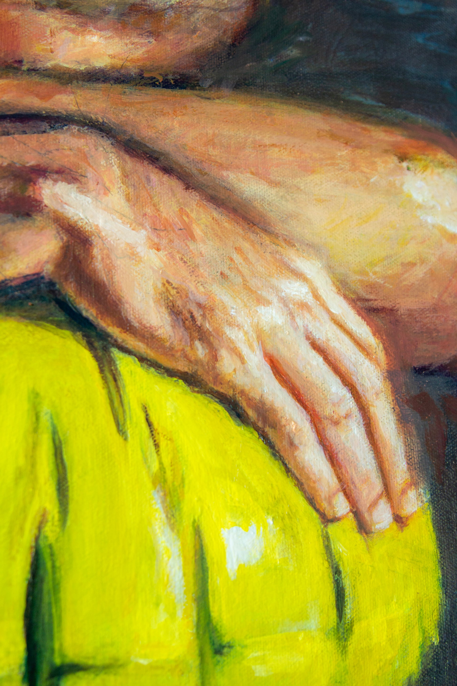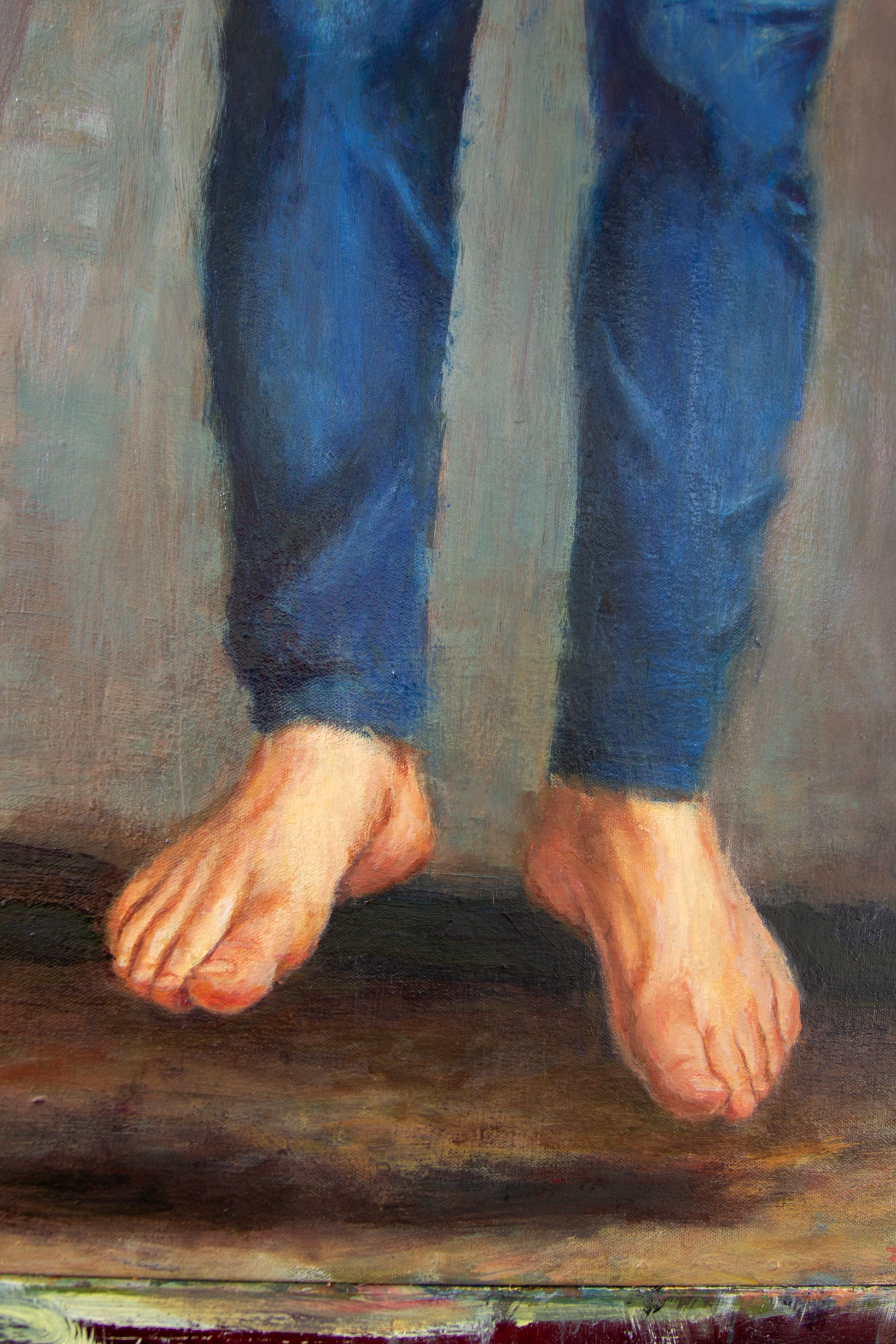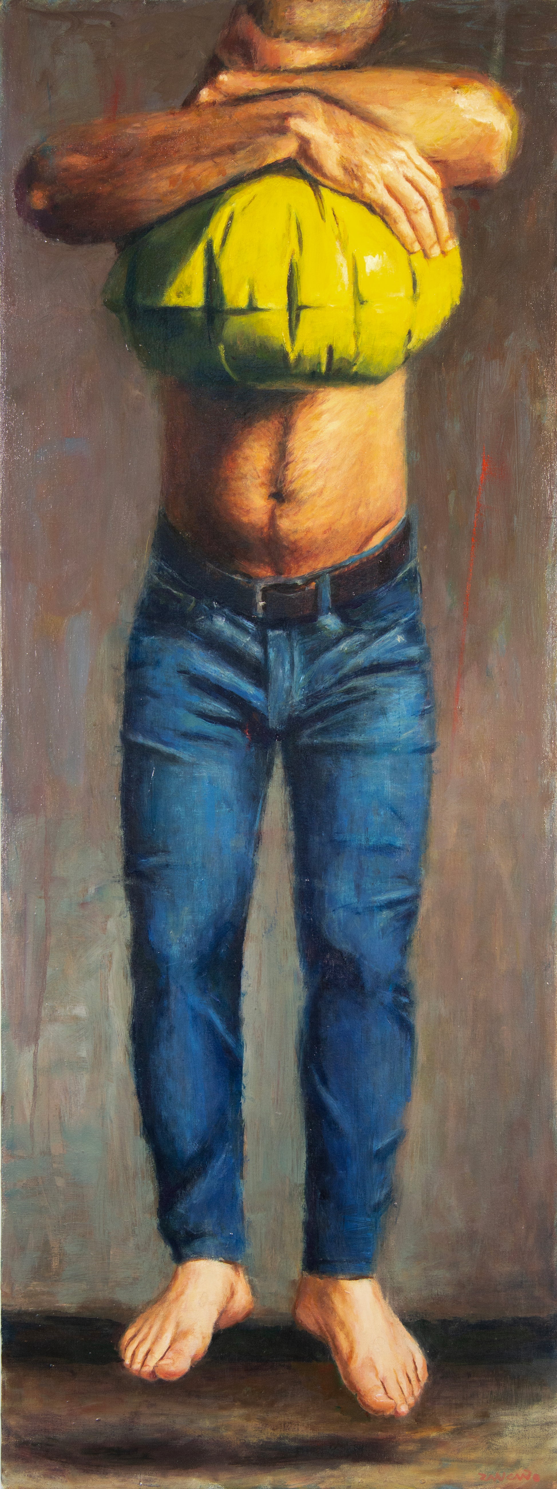 Suspended plays on the phrase Light Sleeper. A figure embraces a luminous yellow balloon, his feet hovering just above the ground, poised at the threshold between rest and ascent. For me, the process was as much about patience and observation as it was about image-making—a lesson in slowing down, refining perception, and allowing a painting to unfold in its own time.